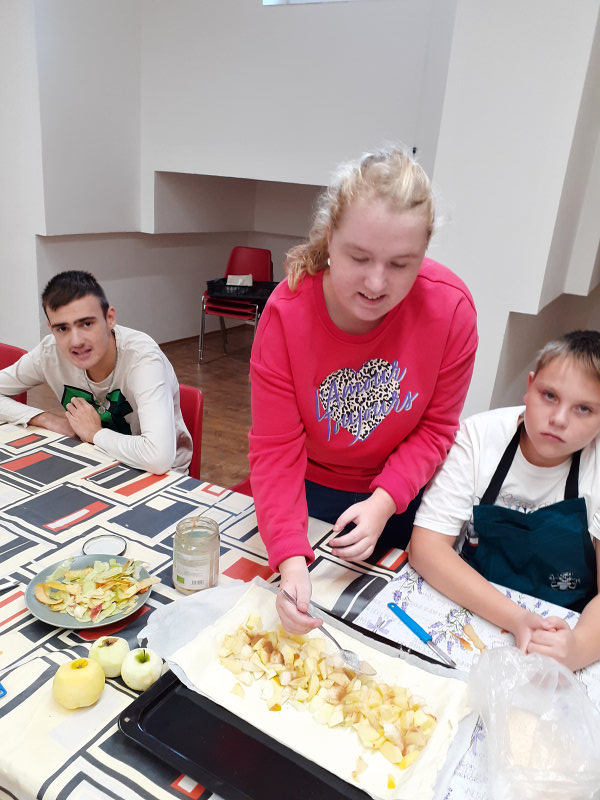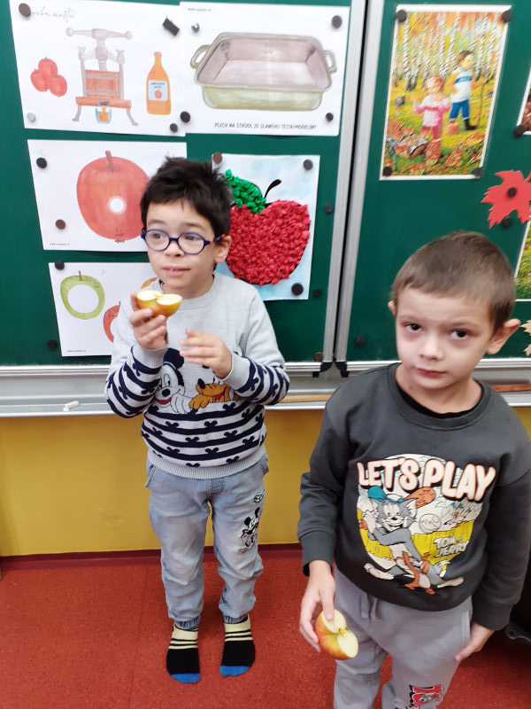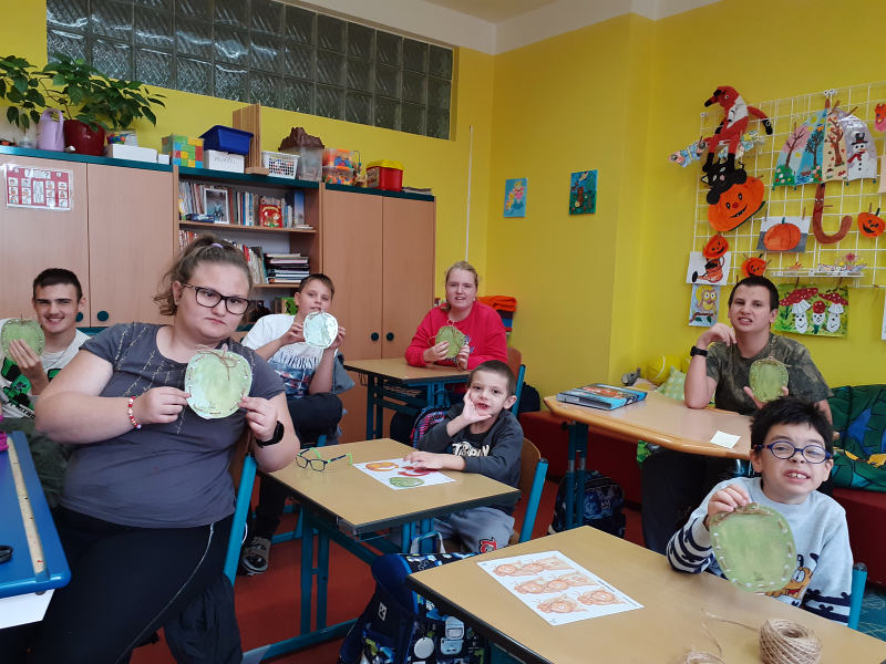Žáci ZŠ speciální I. třídy dne 30. 9. 2025 pozorovali změny v přírodě na podzim, pojmenovávali ovocné stromy. Seznámili se s prací v ovocném sadu, se zpracováváním jablek. Nakreslili jabloň plnou šťavnatých jablek. Počítali křížaly a jablíčka, mladší žáci je třídili podle barvy. Provlékali jsme provázek otvory v obrázkovém jablíčku a jako sladkou odměnu jsme si upekli jablečný štrůdl a zbytek jablíček jsme nakrájeli a nasušili na křížaly.